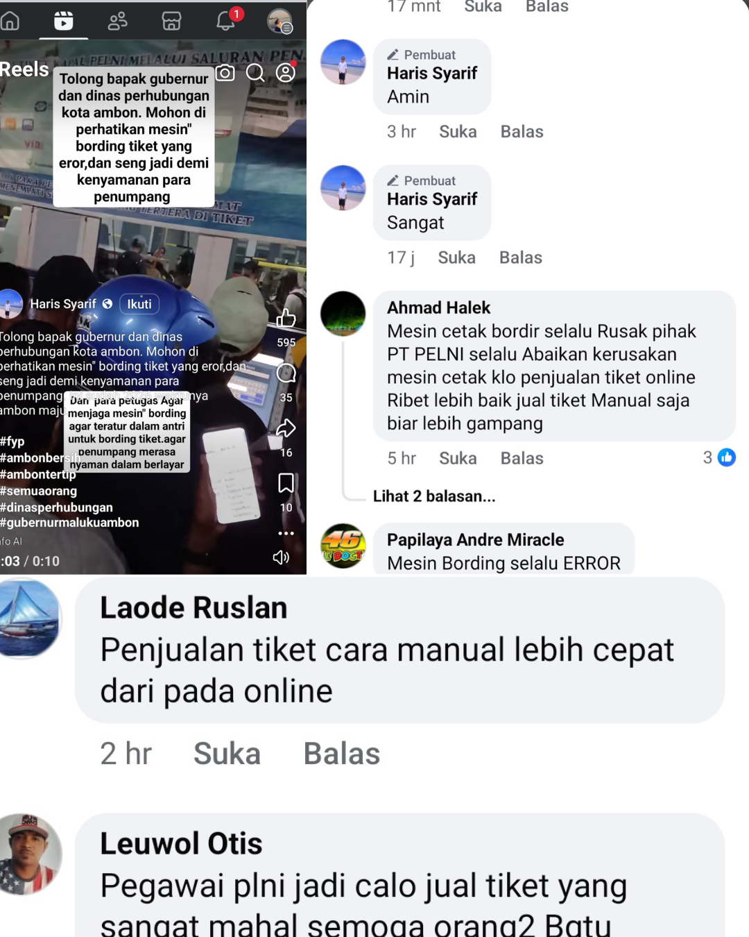 Selain itu, sejumlah komentar warga di kolom komentar unggahan tersebut turut menyoroti persoalan klasik yang dinilai kerap terjadi. Salah satu warga menyebutkan bahwa mesin pencetak tiket PT Pelni Cabang Ambon “sering rusak dan terkesan selalu diabaikan”.